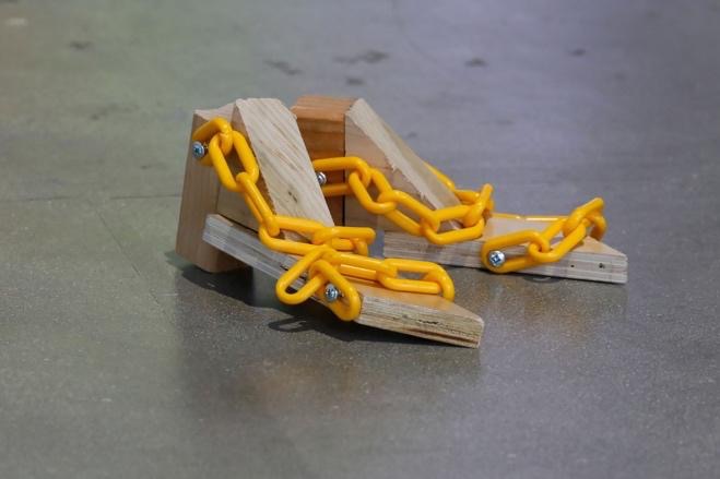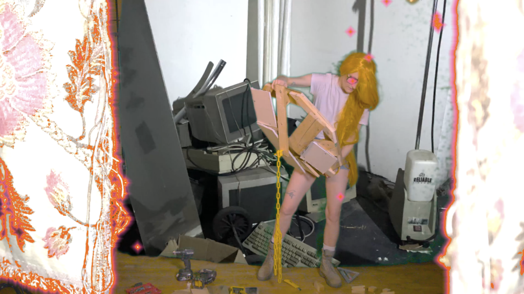 Johnny Forever Nawracaj’s work weaves surrealist narrative through sculpture, installation, video, gesture, and drag-inflected performance to explore love, loss, and labour in the context of radical queer and trans cultural production. We invited Nawracaj to respond to the site of Espace + Village, a former BEDO clothing store and Yellow shoe store—both familiar Québec retailers—currently in transition, awaiting large-scale renovations to become the headquarters for a group of LGBTQ+ non-profits in 2027. Nawracaj presents a series of their OMG shoes crafted from construction detritus like chains and mesh, as well asFirmGrip, a video depicting an erotic encounter between a glove and a sheet of plywood. The artist also premieres a new performance-based video, If These Walls Had Boobs, based on footage shot inside the dilapidated building.